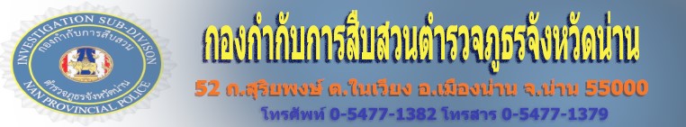 .....กก.สส.ภ.จว.น่าน ได้จัดทำโครงการ พัฒนาเทคนิคการสืบสวนสมัยใหม่โดยการนำเทคโนโลยี่มาใช้ในการสืบสวน คือการใช้ ระบบ LINE ในการปฏิบัติหน้าที่ และนำมือถือสมาร์ทโฟนมามีส่วนร่วมในการทำงานด้วย จึงทำให้การปฏิบัติหน้าที่ในหน้าที่ตำรวจมีความคล่องตัวยิ่งขึ้น (เพิ่มเติม) |